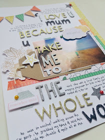 Master Forger Lisa was inspired by the words found on the b-side of one of her kit papers and then built up her multi-alphabet title from there. One fussy cut word plus four different alphabet stickers as well as several different wordy embellishments not to mention her handwriting makes for a very wordy layout! You can find out more on her blog here.
